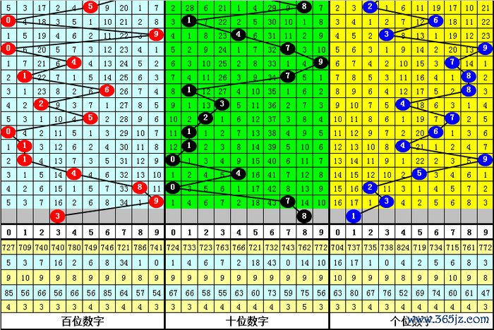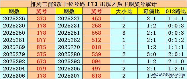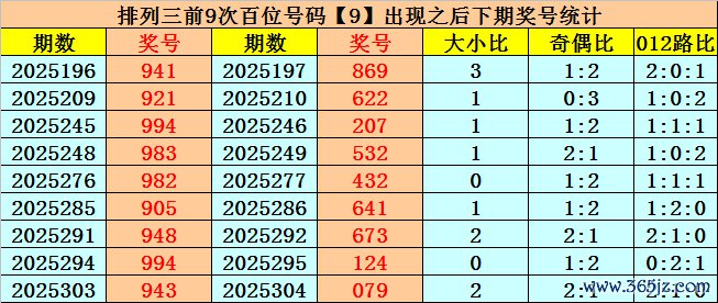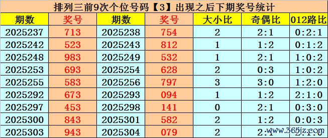 个位前9次开出号码3时,该位下期奖号离别为:4-2-2-8-7-4-1-2-9,其中号码个数奇偶比是3:6,大小比是3:6,012路比是1:4:4。